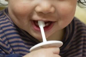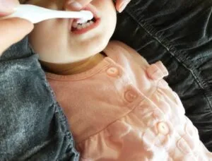 歯が生えたら、ガーゼや綿棒でお口の中に物が入るのを慣れさせることが大事です。